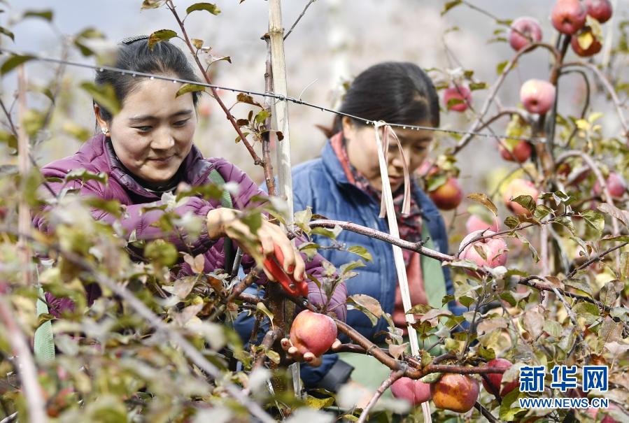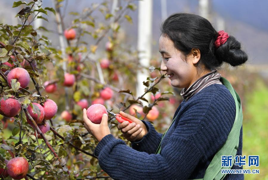 在林芝市米林县羌纳乡西藏林芝现代苹果标准化园区,务工人员在采摘苹果(11月22日摄)。新华社记者 张汝锋 摄
