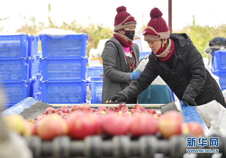 在林芝市米林县羌纳乡西藏自治区盛世农业科技有限公司苹果基地,务工人员在苹果筛选线上分拣苹果(11月22日摄)。新华社记者 张汝锋 摄