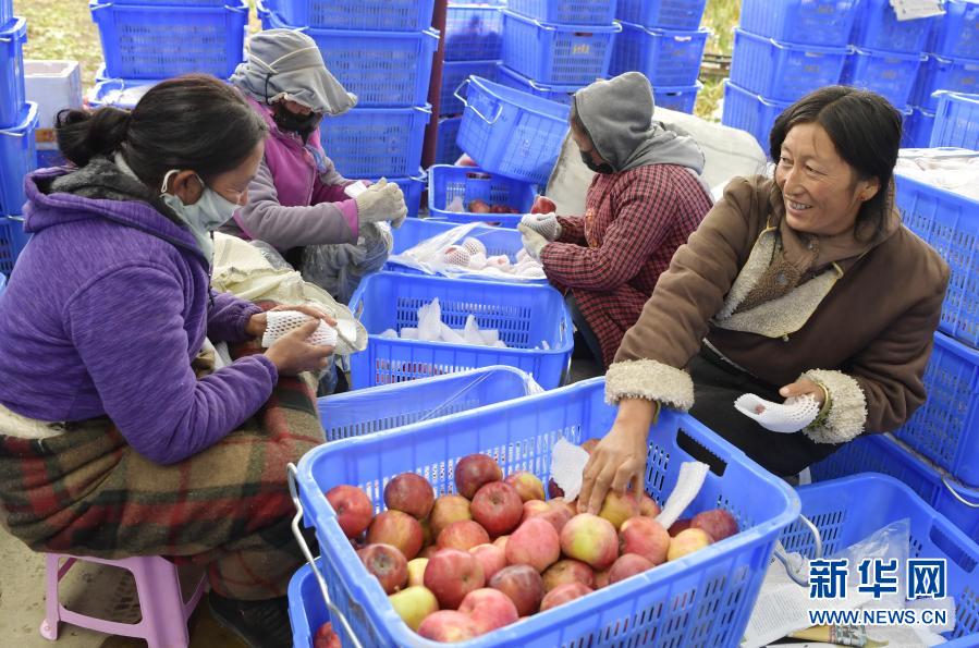 在林芝市米林县羌纳乡西藏自治区盛世农业科技有限公司苹果基地,务工人员在包装苹果(11月22日摄)。新华社记者 张汝锋 摄