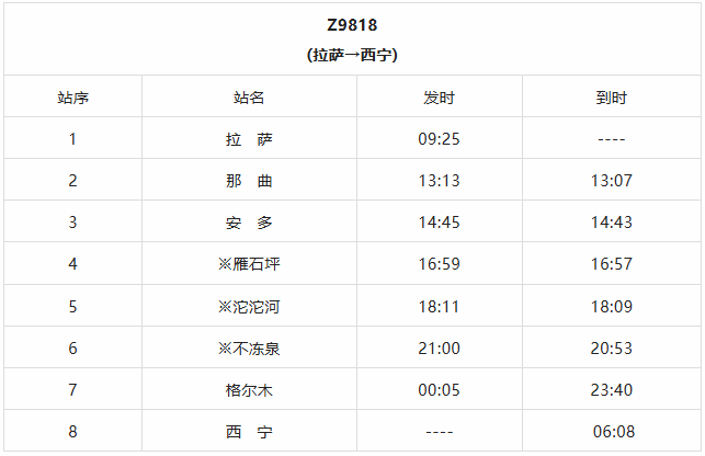 2026年1月3日至1月24日拉萨至西宁间加开Z9818次临时旅客列车。