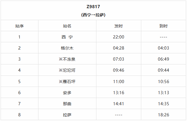 2026年1月1日至1月24日西宁至拉萨间加开Z9817次临时旅客列车。