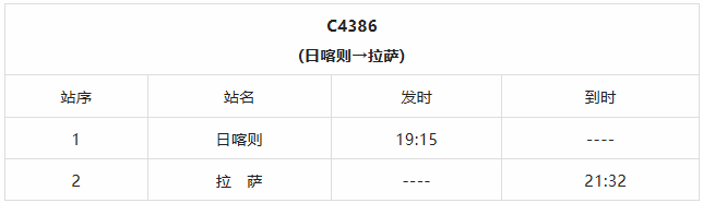 2026年1月2-4日、9-11日、16-18日、23-25日日喀则至拉萨间加开C4386次临时动车组旅客列车。