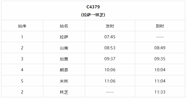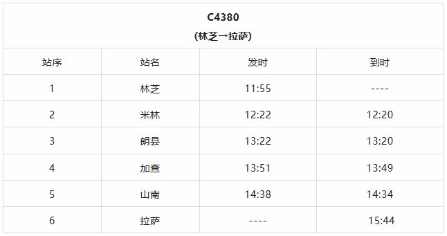 2025年12月31日至2026年1月25日拉萨至林芝加开C4379次临时动车组旅客列车。