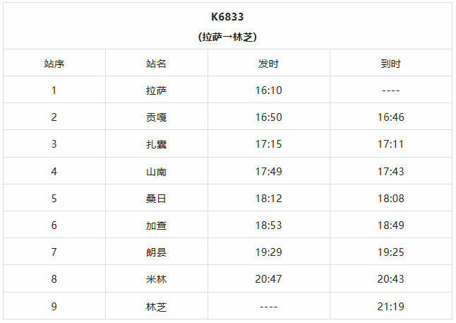 2025年12月31日至2026年1月24日拉萨至林芝间加开K6833次临时旅客列车。