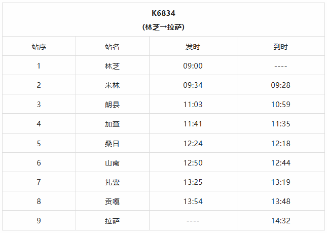 2026年1月1日至1月25日林芝至拉萨间加开K6834次临时旅客列车。