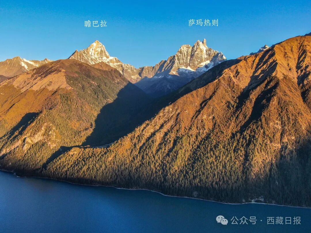 从巴松错南岸的结巴村,往西北望去,可以看到被称之为“国王宝座”的扇状雪山——萨玛热则(海拔6132米),及其左侧的金字塔形角峰瞻巴拉(海拔6056米)。