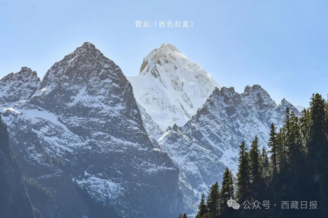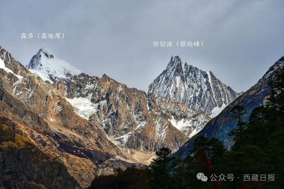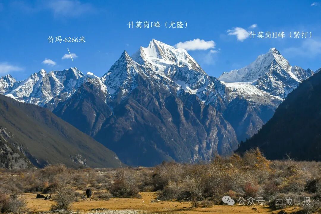 沿途可以看到标志性的尖峰——什莫岗(斯木岗)双峰,其中1峰又称“尤隆”(海拔6414米)、2峰又称“紧打”(海拔6190米),以及霞拉(又称“西色拉莫”,海拔6304米)、马青日(海拔5930米)、容倾贡(海拔6188米)、曲果(又称“雪觉岗”,海拔6842米)等诸峰。