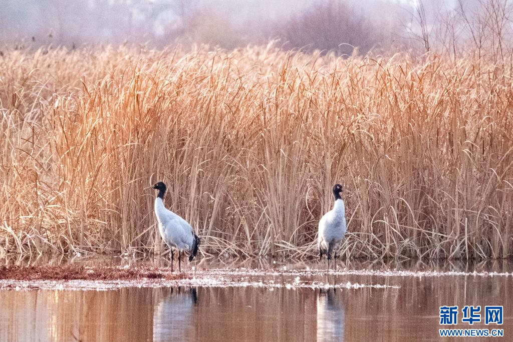 1月10日,在拉萨市拉鲁湿地拍摄的黑颈鹤。新华网 旦增努布 摄