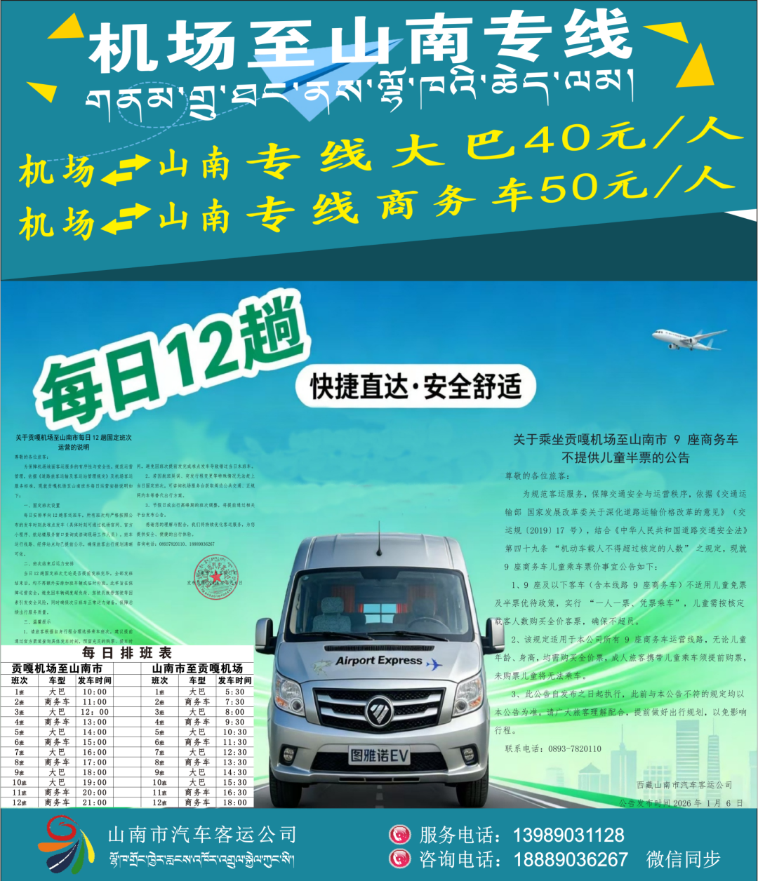 为进一步优化运输服务供给,切实满足广大旅客往返机场的出行需求,提升机场专线运营效率与便捷度,经公司研究并报相关部门备案,决定自2026年1月8日起,对山南市区至拉萨贡嘎国际机场客运专线排班表进行调整。现将具体事宜公告如下: