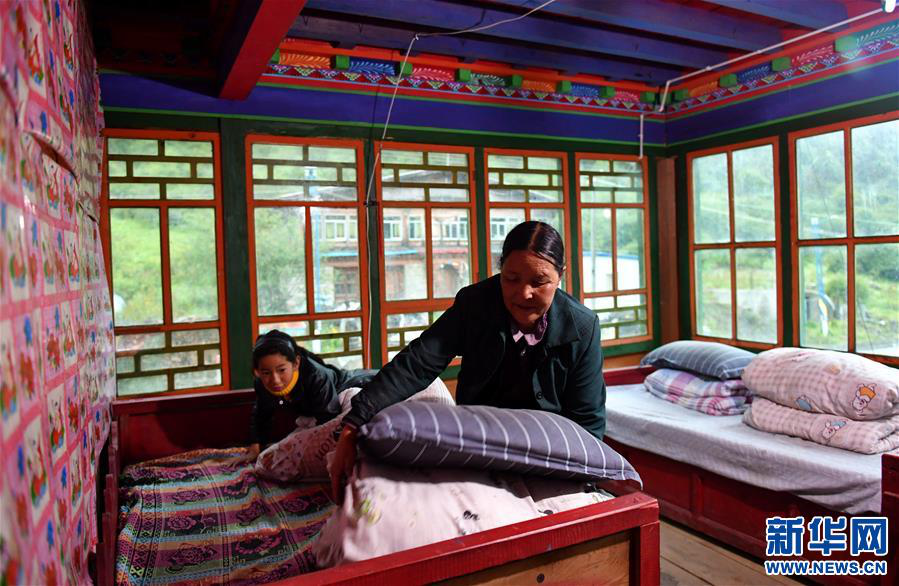 玉麦乡居民次仁措姆在整理自家的家庭旅馆,她家里有20张床铺,每张床铺每晚35元(8月10日摄)。记者 晋美多吉 摄
