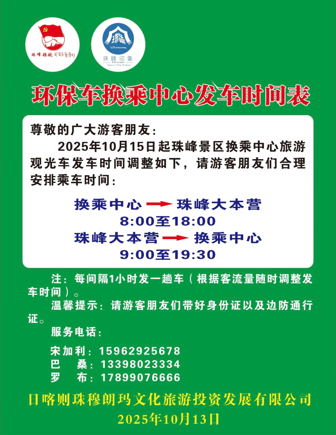 受季节气候影响,为满足游客游览景区的需要,珠峰景区旅游观光车自2025年10月15日起发车时间调整如下: