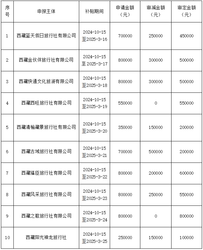 西藏天泰会计师事务所(普通合伙)接受西藏自治区文化和旅游厅的委托,根据《第七轮“冬游西藏”市场促进奖励(补助)优惠政策实施方案》(藏文旅厅发〔2024〕75号)相关规定,对33家旅行社提交的申报资料进行严格审核,奖励日期为2024年10月15日至2025年3月15日。