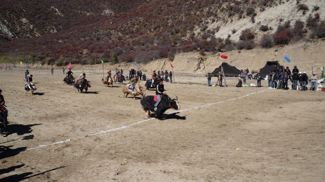 随着裁判一声清脆的哨响,比赛正式开始。骑手们俯身贴紧牛背,轻抖缰绳驾驭牦牛疾驰而出,尘土飞扬间,牦牛奔腾的身姿与骑手矫健的身影融为一体。决赛现场气氛更为热烈。骑手们与牦牛默契配合,时而加速疾驰,时而灵活调整方向,考验着骑手的胆识、耐力与驾驭技巧。