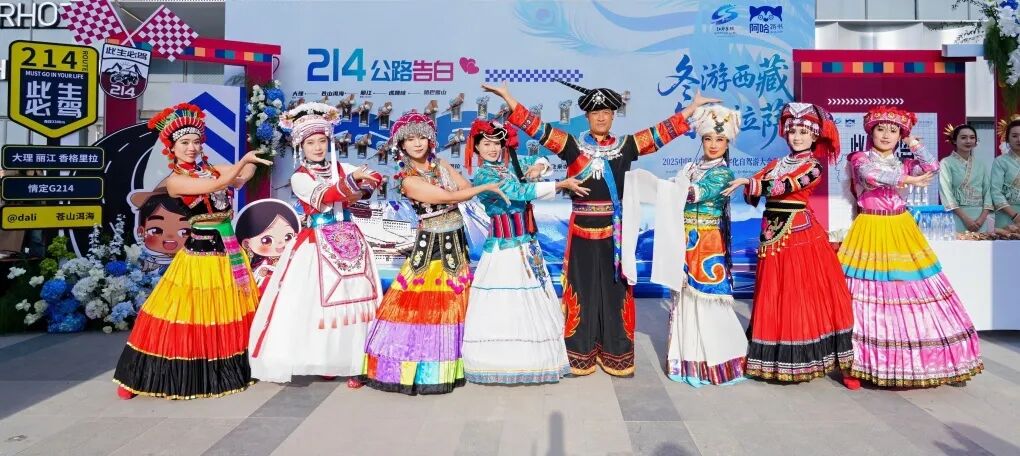 在热烈的氛围中,顾正军、类成云与阿哈路书CEO刘显德共同登台,为自驾车队授旗。这面旗帜不仅是滇藏文旅联动的象征,更是数字化自驾新征程的号角。随着礼炮鸣响,车队正式出发,云南少数民族同胞载歌载语,以欢快的歌舞为车队送行,场面温馨而热烈。