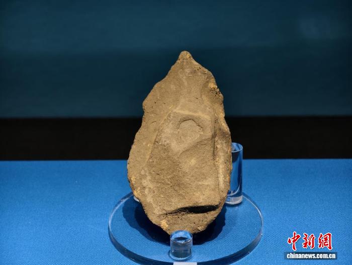12月18日,四川博物院新展“雪山之巅 大河之源——青藏高原的文明崛起与民族融合”开幕,图为四川省甘孜州稻城县皮洛遗址出土的手斧。 (四川博物院供图)