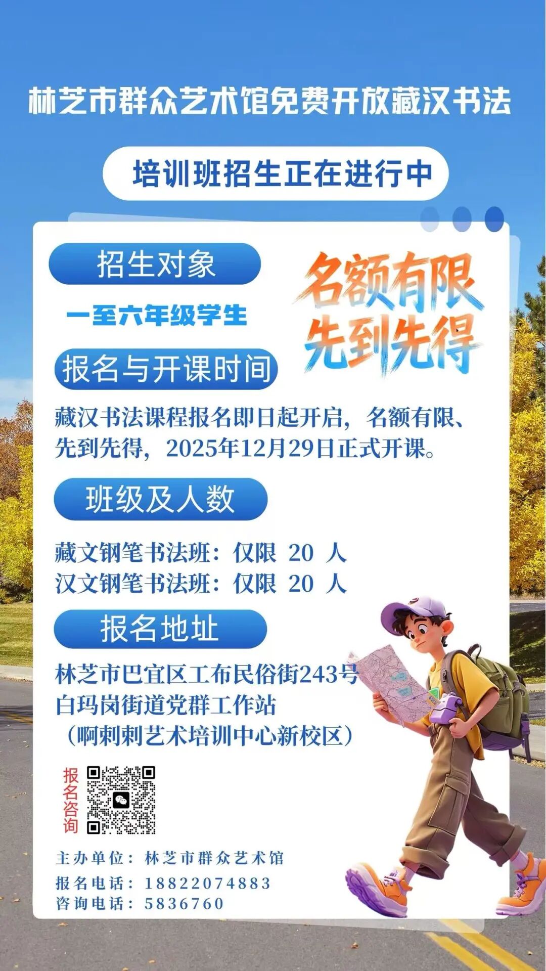 林芝市群众艺术馆主办的2025年藏汉文书法免费培训班开始招生!全程免费授课,开设两门兴趣艺术课程,让孩子在假期解锁新才艺,收获满满快乐成长。