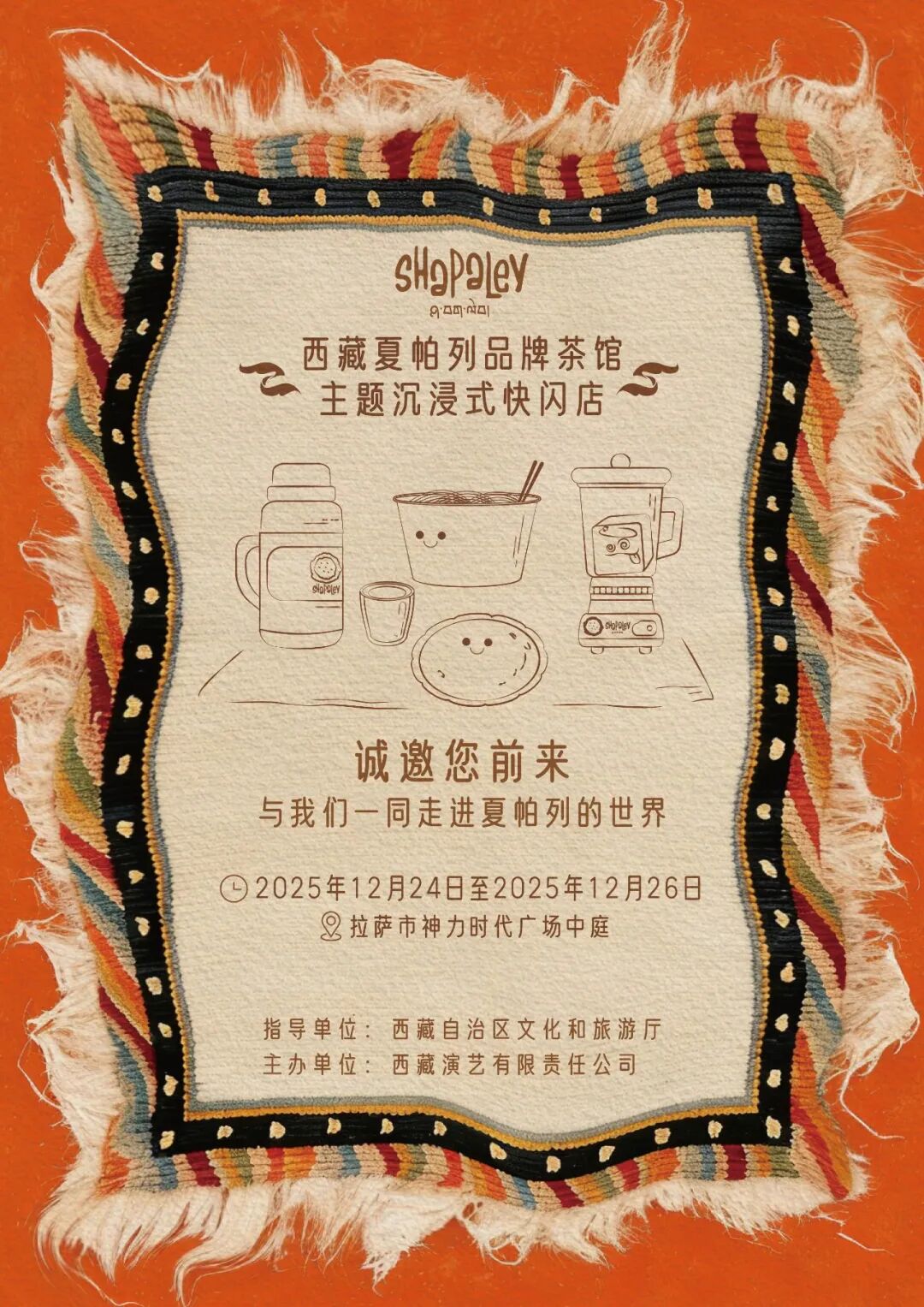 正值第八轮“冬游西藏”活动火热开展之际,一场由西藏自治区文化和旅游厅指导、西藏演艺有限责任公司承办的文化盛宴即将启幕。记者从活动承办方获悉,西藏夏帕列文创将于2025年12月24日至26日,在拉萨市城关区神力时代广场一楼中庭举办为期3天的茶馆主题沉浸式体验快闪活动,以文创新形态赋能冬季旅游,为雪域高原的冬日增添别样活力。