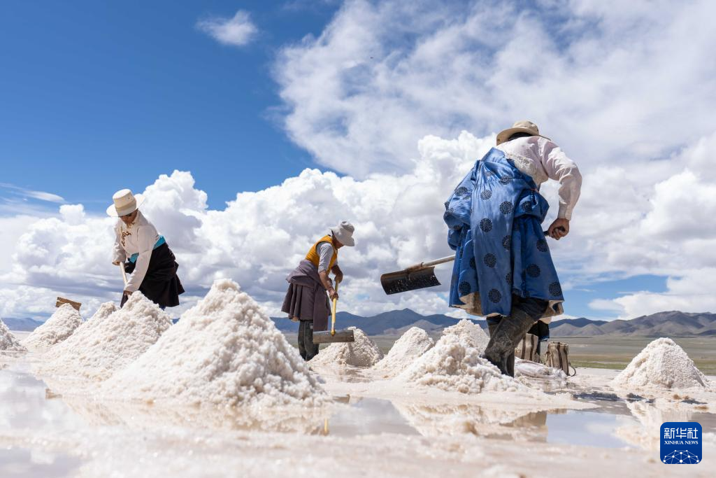 7月20日,革吉县牧民在采盐。新华社记者 旦增尼玛曲珠 摄