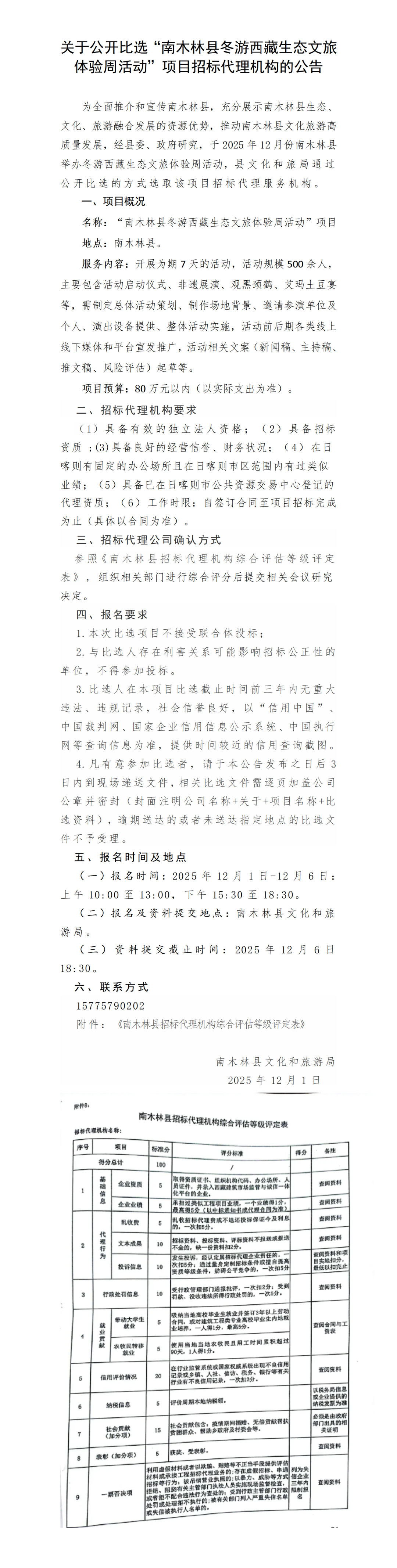 【公告】关于公开比选“南木林县冬游西藏生态文旅体验周活动”项目招标代理机构的公告