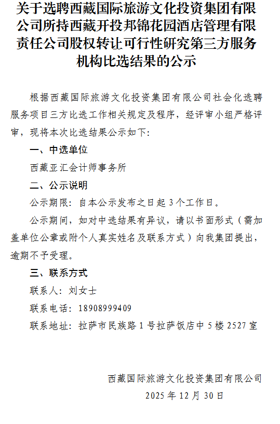 关于选聘西藏国际旅游文化投资集团有限公司所持西藏开投邦锦花园酒店管理有限责任公司股权转让可行性研究第三方服务机构比选结果的公示