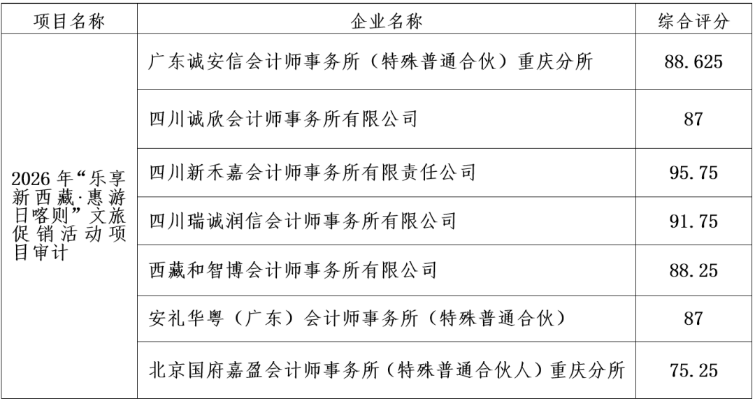 经提交相关会议研究决定,择优选取综合评分最高的四川新禾嘉会计师事务所有限责任公司为2026年“乐享新西藏·惠游日喀则”文旅促销活动项目审计服务方。