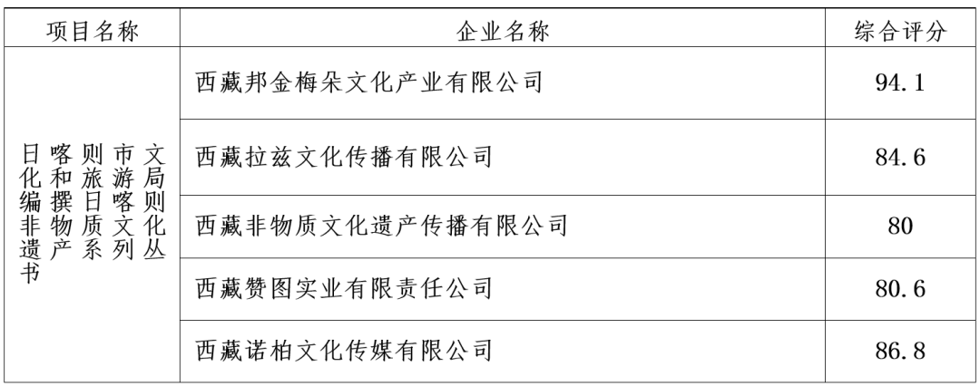 2026年1月27日,在“文旅日喀则”微信公众号上发布了《日喀则市文化和旅游局关于编撰日喀则非物质文化遗产系列丛书的公告》,公告期间共收到5家单位递交的比选资料。2026年2月10日,市文化和旅游局召开了采购领导小组比选会,领导小组根据参选单位报价、企业资质、方案、项目经验、沟通对接便捷度等方面进行综合评分,比选结果如下。