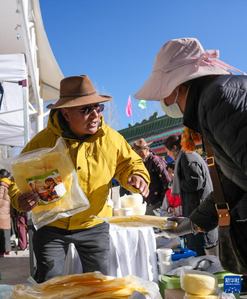 12月10日,商户在拉萨市宗角禄康公园的供销大集上向顾客介绍商品。新华社记者 晋美多吉 摄