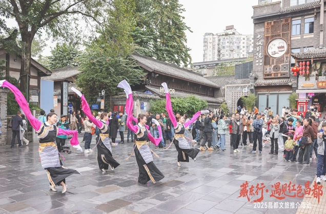 在成都三大城市地标——春熙路、宽窄巷子与东郊记忆,昌都文旅快闪活动以极具视觉冲击力的民族服饰与原生态舞蹈表演惊艳亮相。演员们身着工艺精湛的民族传统盛装,以刚健有力的舞步、富有叙事感的肢体语言,生动演绎藏东地区的文化底蕴。在春熙路的现代繁华与宽窄巷子的市井烟火之间,舞者以极具张力的表演构建起一道流动的文化风景线,吸引众多市民驻足欣赏、主动参与互动,有效提升了“藏东明珠”在西南地区的品牌感染力。