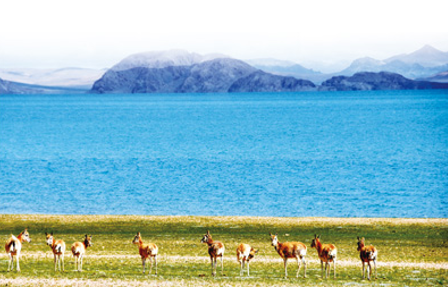 碧蓝的色林错湖畔,藏羚羊自由自在地活动、觅食。新华社记者 曾 涛摄