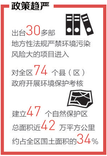 近年来,西藏先后制定出台30多部地方性法规,严禁钢铁、冶炼、化工、造纸等环境污染风险大的项目入境。西藏严格落实矿产资源开发政府“一支笔”审批制度、环境保护“一票否决”制度,严禁“三高”项目,对全区74个县(区)政府开展环境保护考核,为雪域高原的良好生态撑起“保护伞”。