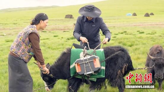 浙江援藏人员给牧民放牧的牦牛绑上“移动式光储一体微电站”设备。毛一丰 供图