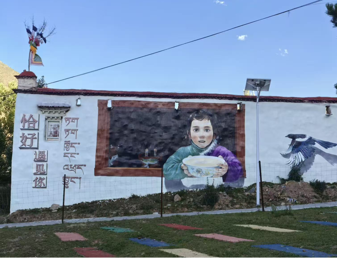 在恰村3组的一栋栋藏式二层小楼外墙上,一幅幅3D壁画栩栩如生,主题为“恰好遇见你”壁画,是恰村“美丽乡村 幸福家园”生态宜居建设项目的子工程之一。
