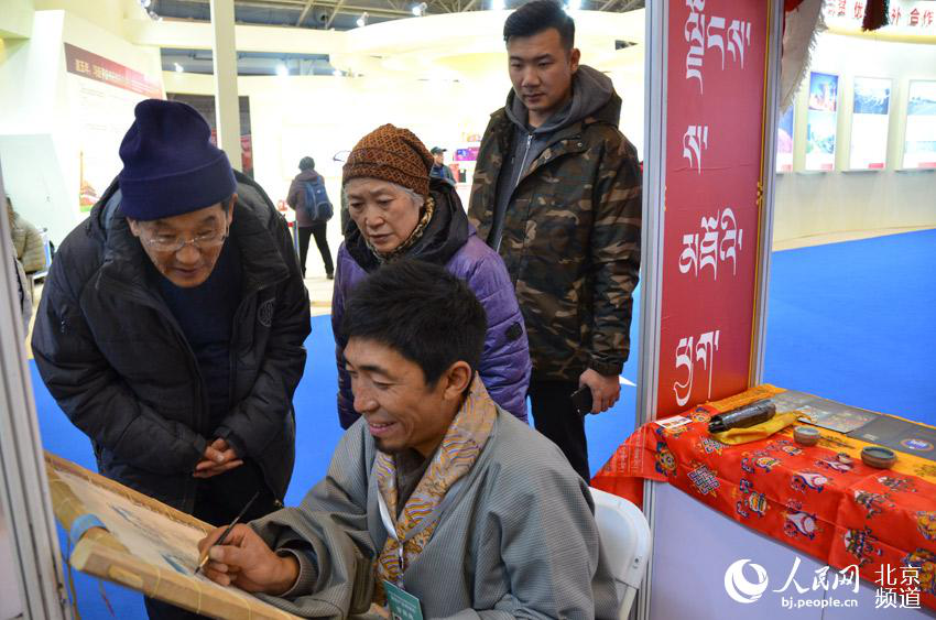 北京对口支援地区特色产品展销会上,唐卡绘制吸引了市民的关注。人民网尹星云 摄