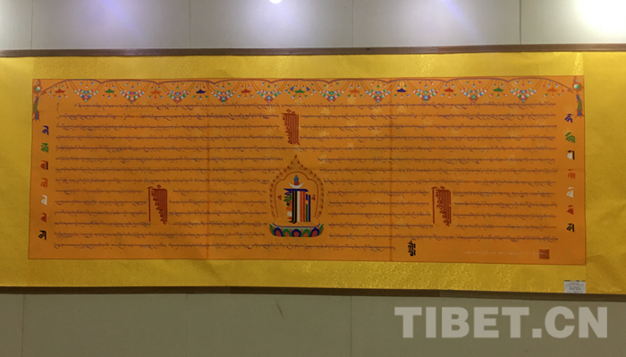 进入展厅,走过影壁,首先映入眼帘的是占据整整一面墙的两幅藏文书法作品。但是篇幅巨大还不是它们最特殊的地方,原来这两幅来自西藏日喀则扎什伦布寺书法家的作品,分别介绍了十世班禅额尔德尼·确吉坚赞和十一世班禅额尔德尼·确吉杰布的传记。主办方西藏高山文化发展基金会负责人向记者介绍,这两幅珍贵的书法作品是“化缘”得来的。“在展的藏文书法,是我工作中去参访时,扎什伦布寺高僧多吉平措等创作捐赠的。”她表示,非常荣幸有这样的机缘,“扎什伦布寺高僧对文化基金会,对民族文化交流非常支持。”