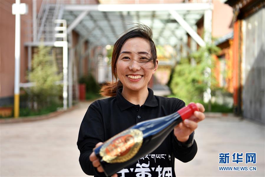 西藏芒康县藏东珍宝酒业有限公司副总经理曲措在展示一款“达美拥”葡萄酒(5月4日摄)。新华社记者 詹彦 摄