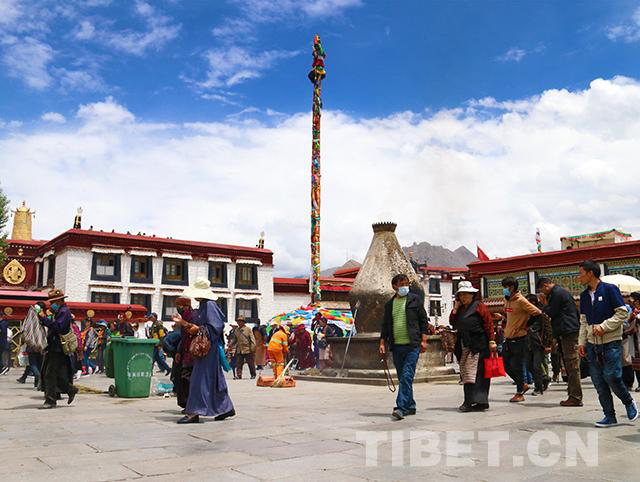 2017年6月9日,藏历四月十五,藏传佛教认为释迦牟尼诞生、成道、涅槃均在这一天,历时藏历四月一整月的萨嘎达瓦节在这天也进入高潮。图为拉萨八廓街上转经的信教群众。摄影:杨悦笙