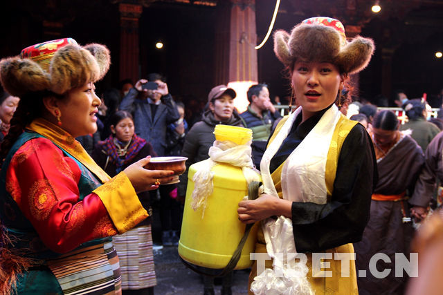 12月3日,藏历十月十五日,是藏传佛教传统的民俗节日“仙女节”,盛装的妇女们迎接一年一度专属她们的节日。图为“仙女”们在白拉姆像前边舞边饮。摄影:贾华加