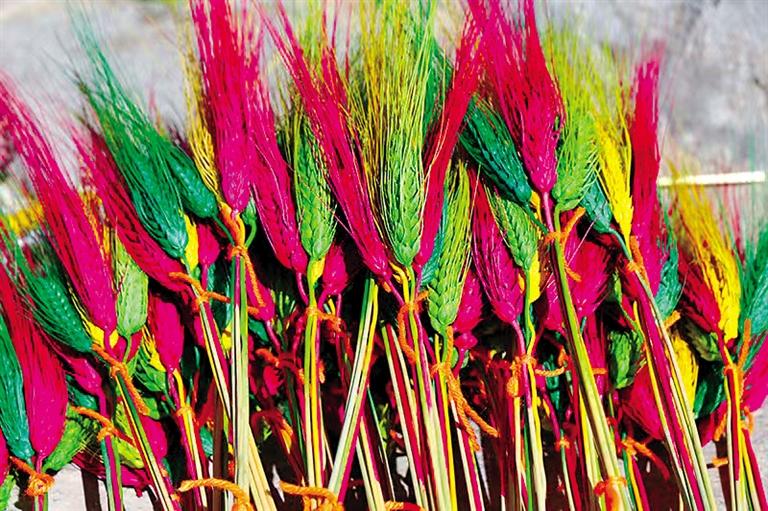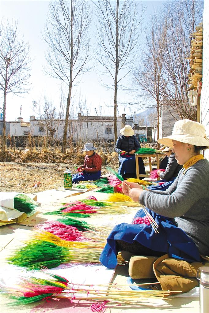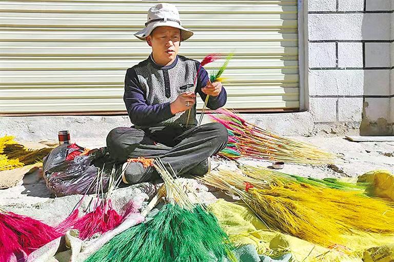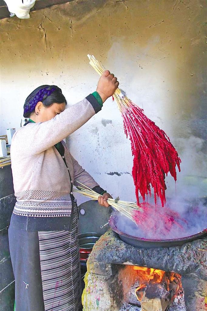 “‘罗萨美朵’是一种经过染色、手工制作、色彩各异的麦穗状花朵,每年春季播种,金秋时节收获,悬挂风干,完好保存。到了藏历11月,居民开始采购染色的颜料和捆扎用的毛线绳,把早已收割晾晒好的‘罗萨美朵’拿出来,为其染色、捆扎,再进行销售。”达珍告诉记者。