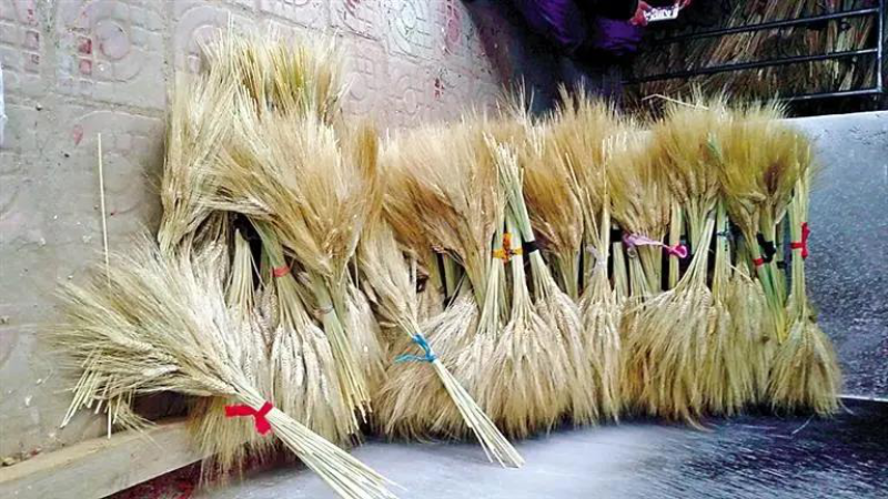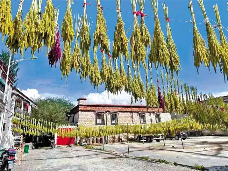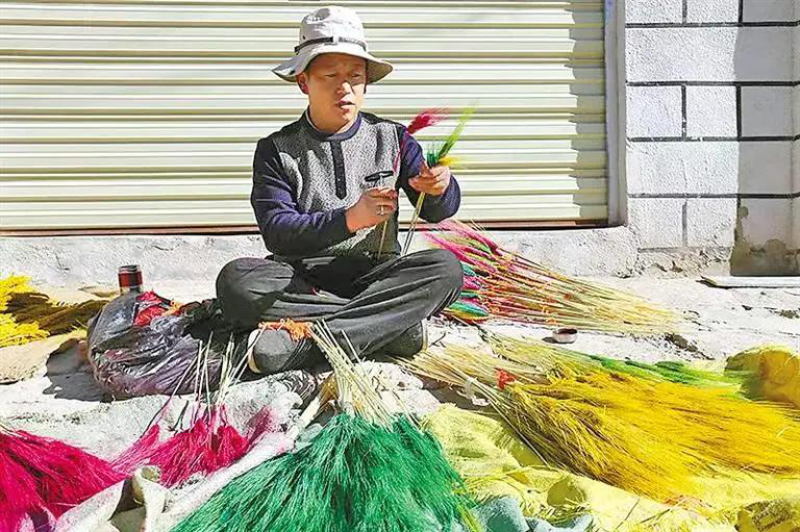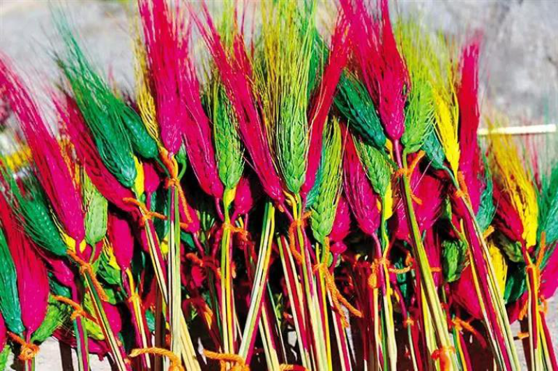 “罗萨美朵”也就是藏年花,在藏语里,“罗萨”是藏历新年,“美朵”是鲜花的意思。是一种经过染色、手工制作、色彩各异的麦穗状花朵,每年春季播种,金秋时节收获,悬挂风干,完好保存。到了藏历11月,居民开始采购染色的颜料和捆扎用的毛线绳,把早已收割晾晒好的‘罗萨美朵’拿出来,为其染色、捆扎,再进行销售。