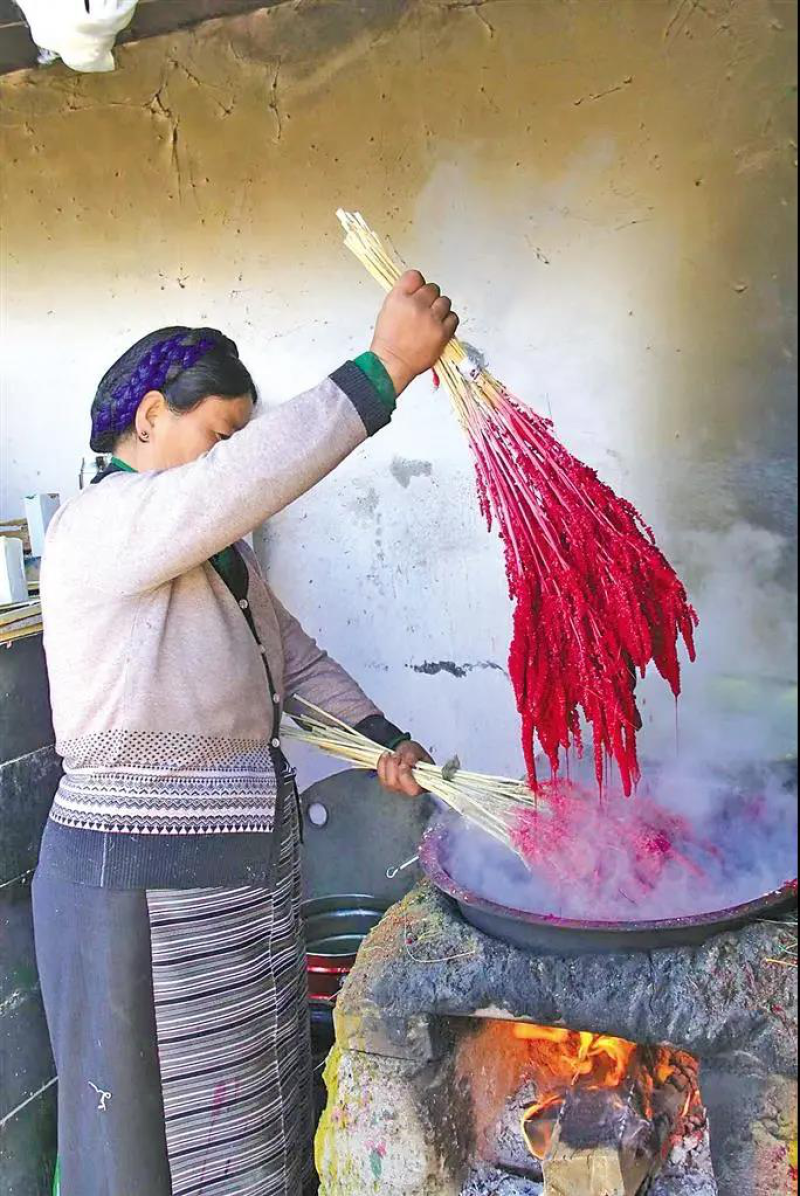 尼珍将浸泡好的“罗萨美朵”拿出来摆放到桌子上,对记者说:“这些日子以来,我和家人一直都在忙着制作‘罗萨美朵’。”图为桑木社区五组居民在为“罗萨美朵”染色