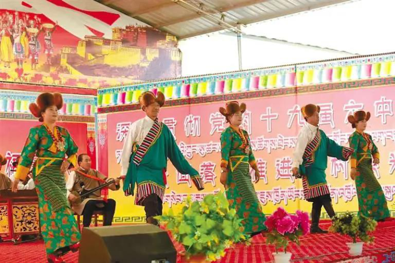 堆龙德庆区东嘎街道桑木社区举办了首届藏年花文化艺术节。艺术节在桑木社区藏年花群众艺术队表演中正式拉开序幕。图为桑木社区首届藏年花文化艺术节上,桑木社区文艺队在表演节目。