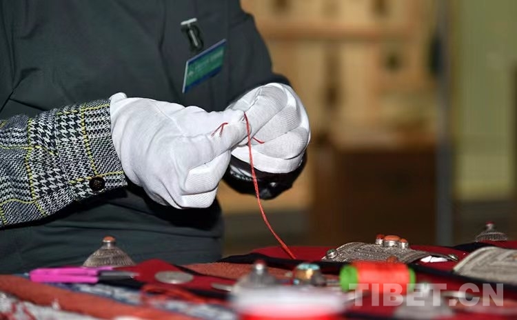 图为西藏博物馆工作人员正在缝制饰品 摄影:王媛媛