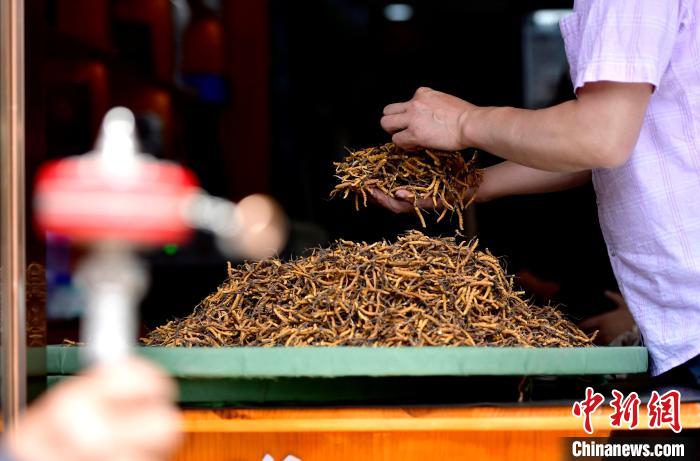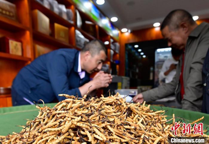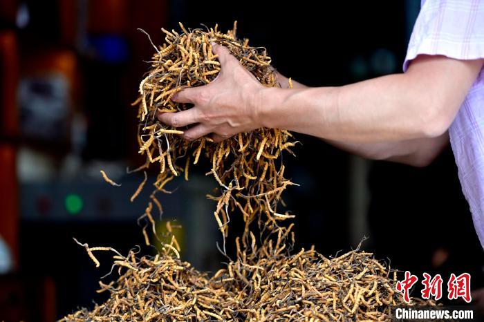 冬虫夏草(简称“虫草”)是一种名贵中药材,素有“软黄金”之称。随着虫草的大批量上市,在拉萨最大的虫草交易市场清真寺虫草交易点,虫草商们正忙着交易。图为7月16日,虫草商张华平正在展示店内的虫草。中新社记者 李林 摄