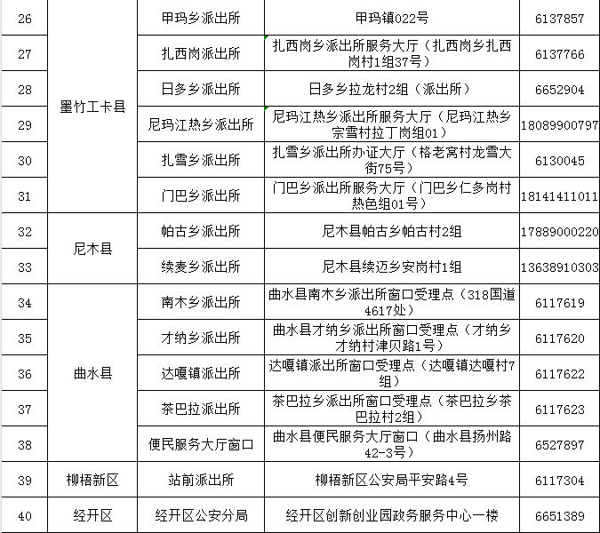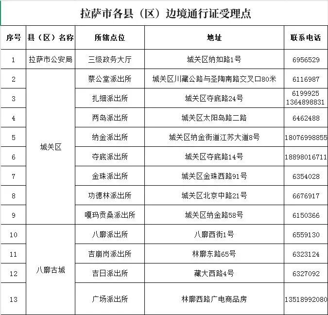 为全面落实边境通行证“异地办、就近办、简化办”要求,切实解决区内外群众办证排队时间长、手续多等问题,拉萨市公安局决定在全市范围内增设40个边境通行证受理点。