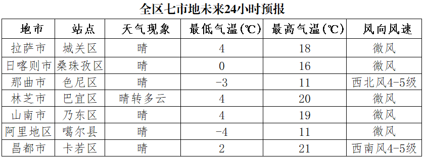 建议:未来24小时,我区大部国道沿线天气晴好;那曲大部有大风天气,提请过往车辆减速慢行,确保交通安全。早晚气温低,提请司乘人员适时增加衣物,做好防寒保暖措施。