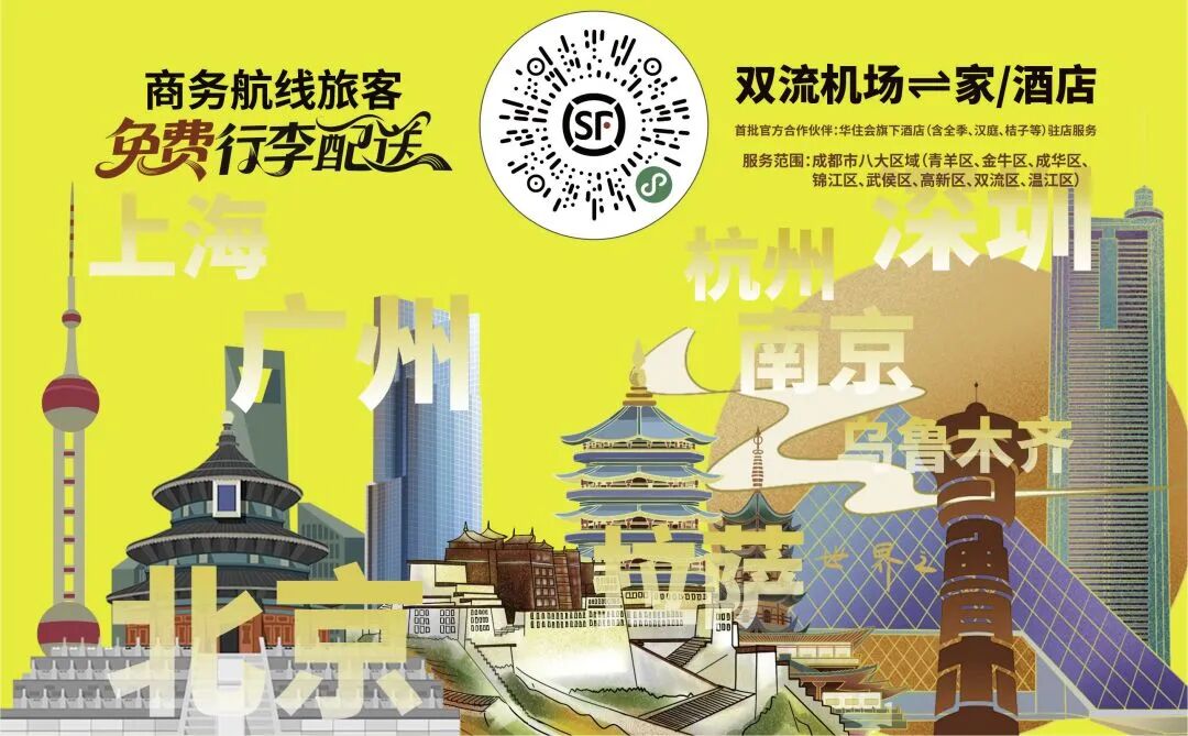 飞机抵达成都双流机场后,您无需在行李转盘前等待,使用该项服务后,托运行李将由顺丰直接安全配送到指定地点,无论是家中或酒店还是其他地方,只要在规定范围内,均可配送,让旅客落地即可开启“巴适”之旅,直奔宽窄巷子、锦里等打卡点!