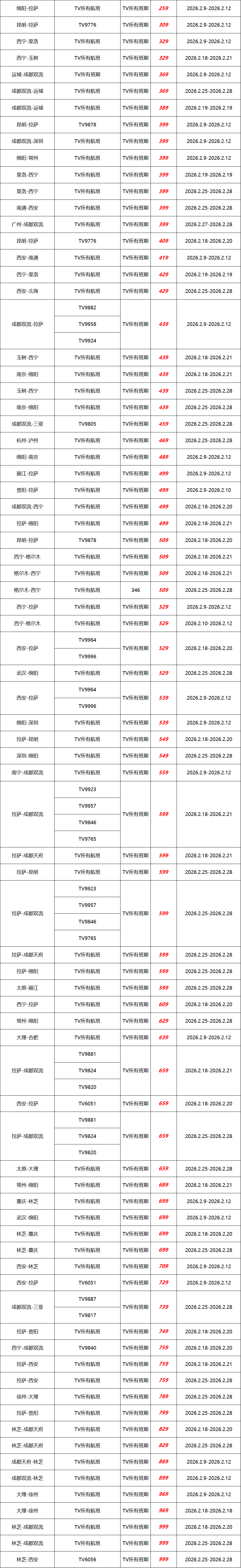 飞拉萨最低259元