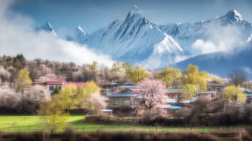 三月,当四周雪山还未完全苏醒,漫山桃林已在蓝天与残雪间恣意盛放。相比别处,这里的桃树更加随性自在,或孤挺于坡上,或成林于河畔,透着一股未经雕琢的野性之美。