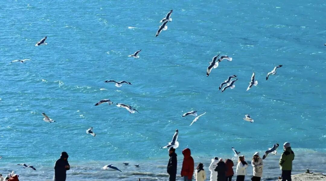 不同于夏季的碧波荡漾,冬日羊湖仅在岸边浅水处有一圈薄冰,湖水清澈见底,水下鹅卵石清晰可见,微风掠过,浪声与风声交织,偶尔有水鸟掠过湖面,灵动又治愈。
