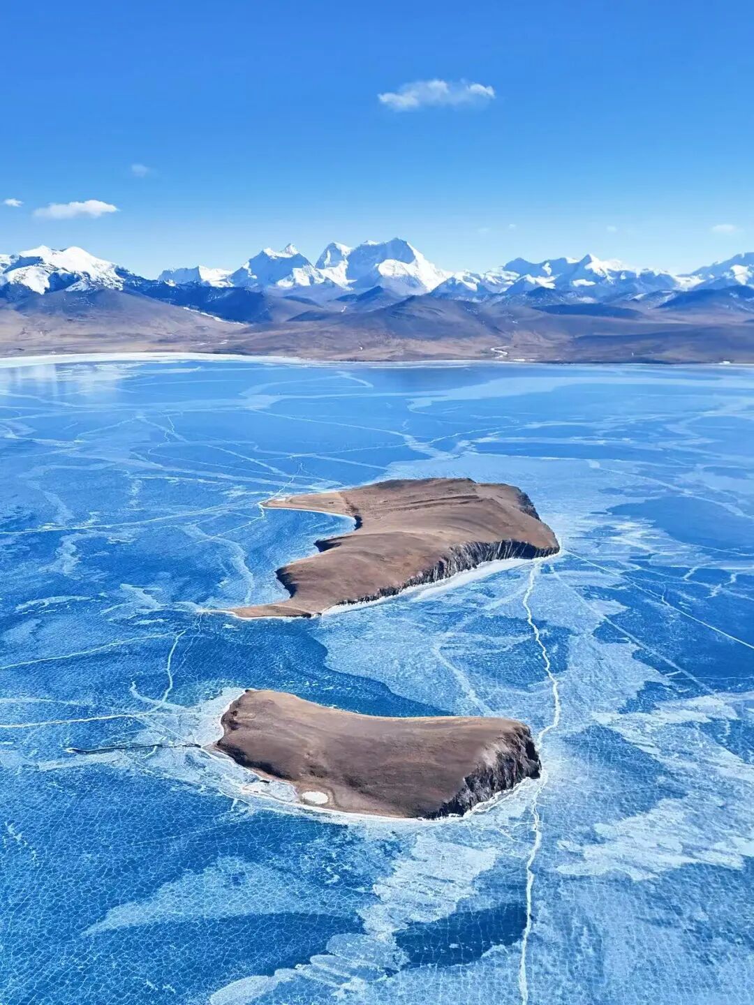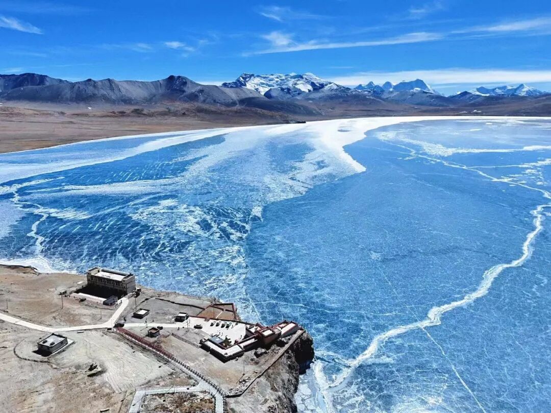 藏语意为“少女的眼泪”,冬日的普姆雍错直接化身“冰雪女王”,湖面凝结成通透的蓝冰,冰面裂纹纵横交错,细碎气泡被封存其中,在日光下泛着深浅不一的蔚蓝色,震撼到失语。